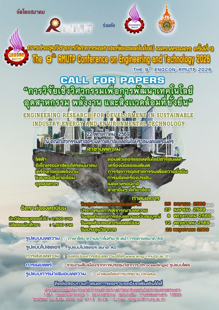 ขอเชิญชวนส่งบทความเข้าร่วมงาน การประชุมวิชาการทางวิศวกรรมศาสตร์และเทคโนโลยี มทร.พระนคร ครั้งที่ 9