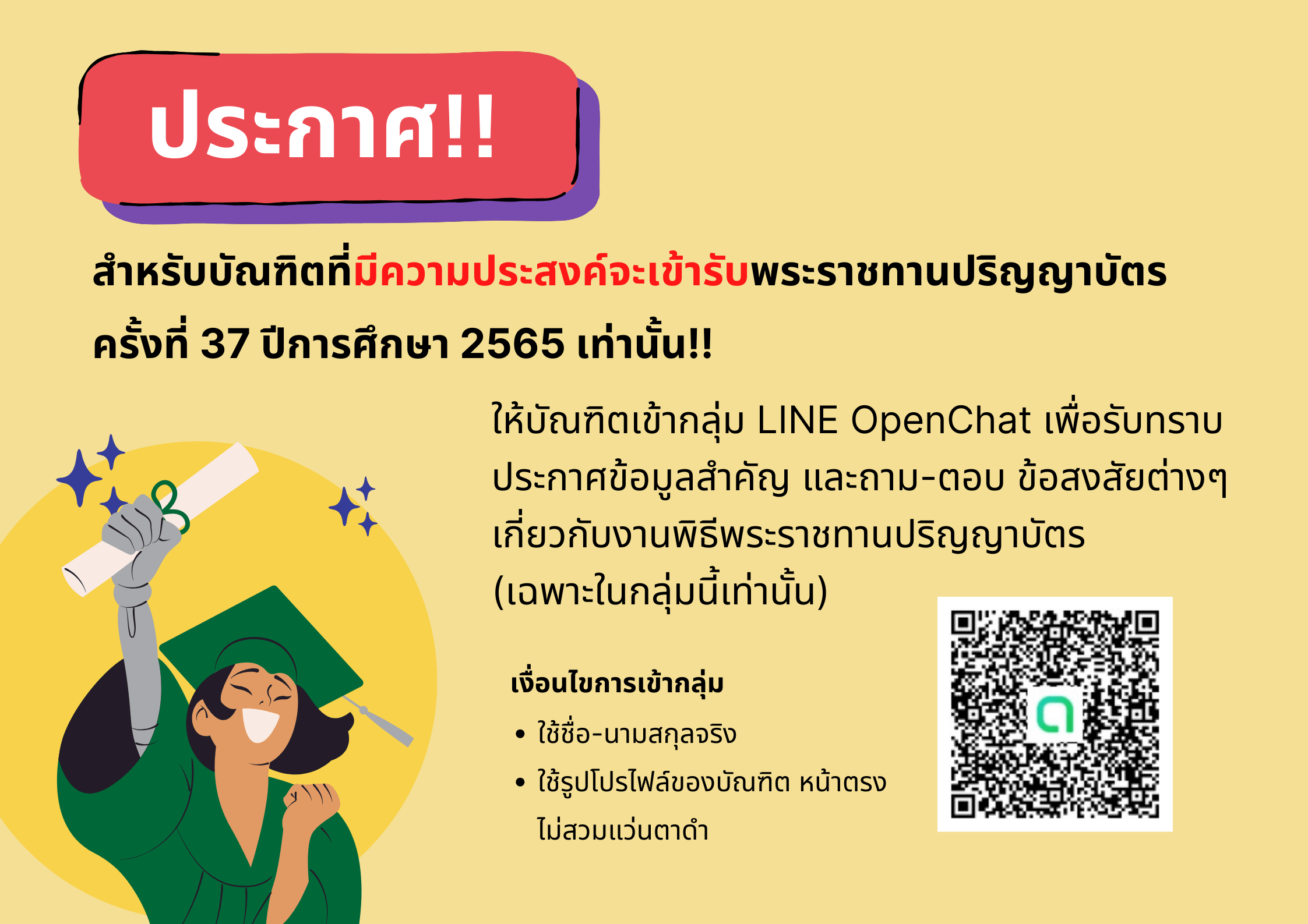 เพื่อรับทราบประกาศข้อมูลสำคัญ และถาม-ตอบ ข้อสงสัยต่างๆ เกี่ยวกับงานพิธีพระราชทานปริญญาบัตร