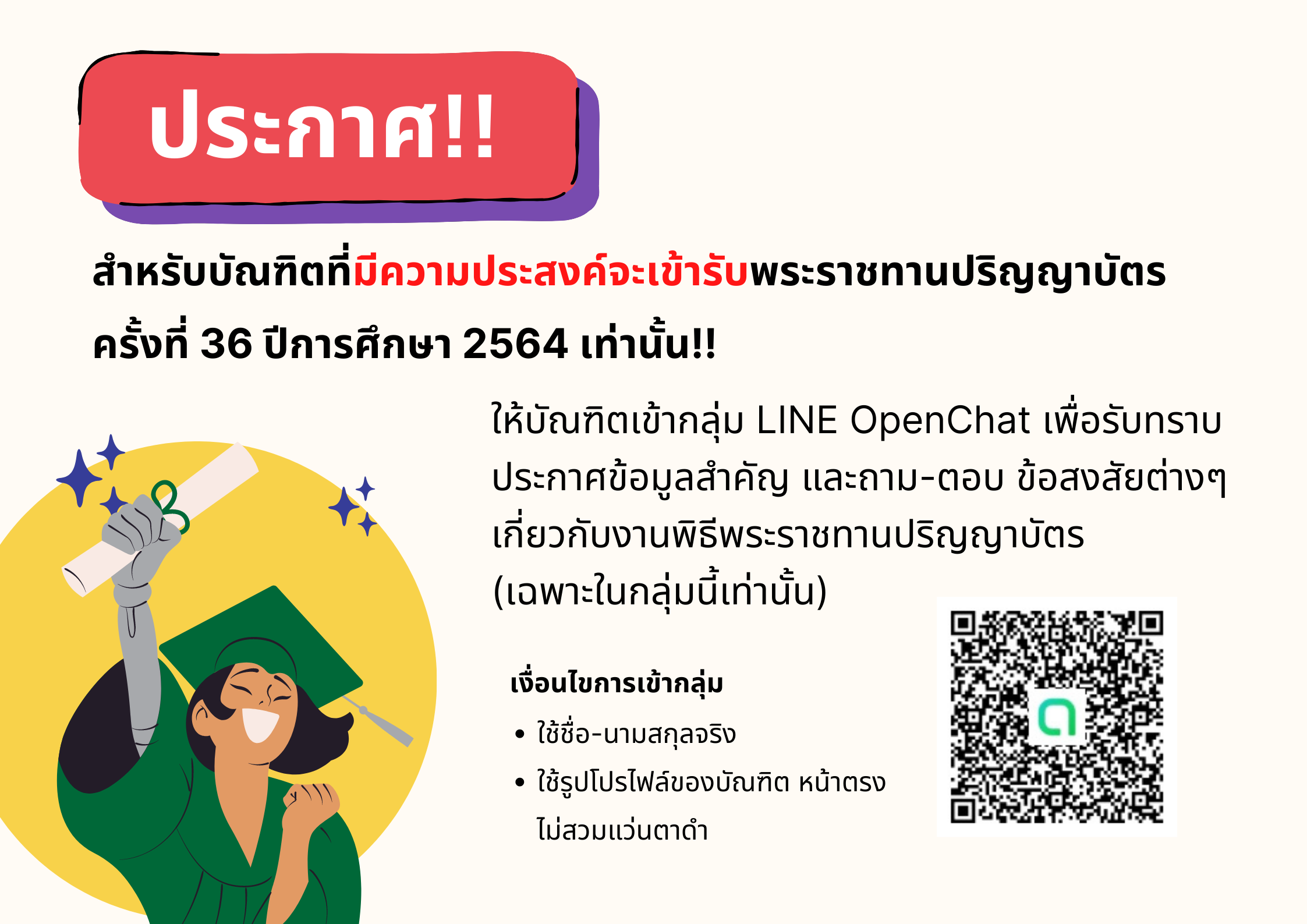 บัณฑิตคณะวิศวกรรมศาสตร์ ที่มีความประสงค์จะเข้ารับพระราชทานปริญญาบัตร ครั้งที่ 36 ปีการศึกษา 2564 ขอให้บัณฑิตเข้ากลุ่ม LINE OpenChat เพื่อรับทราบประกาศข้อมูลสำคัญ และถาม-ตอบ ข้อสงสัยต่างๆ เกี่ยวกับงานพิธีพระราชทานปริญญาบัตร (เฉพาะในกลุ่มนี้เท่านั้น) เพื่อไม่เป็นการรบกวนบุคคลอื่นในกลุ่ม