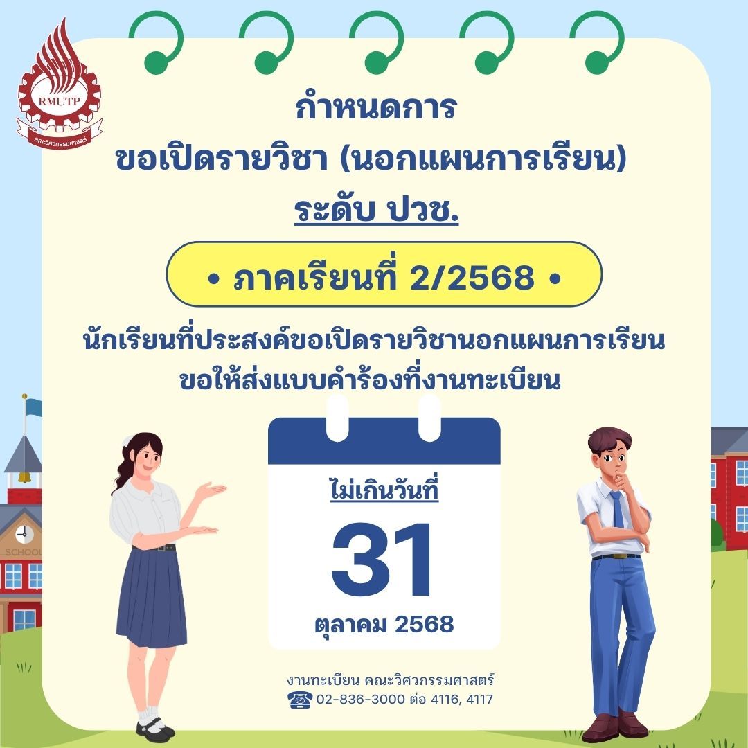 ข่าวประชาสัมพันธ์ กำหนดการขอเปิดรายวิชานอกแผนการเรียน ระดับ ปวช. ภาคเรียนที่ 2/2568 Posted October 16, 2025October 16, 2025 admin 📣📣ประกาศจากคณะวิศวกรรมศาสตร์ มทร.พระนคร📣📣 กำหนดการขอเปิดรายวิชานอกแผนการเรียน ระดับ ปวช. ภาคเรียนที่ 2/2568 นักเรียนที่ประสงค์ขอเปิดรายวิชา ขอให้ส่งคำร้องที่งานทะเบียน ไม่เกินวันที่ 31 ตุลาคม 2568
