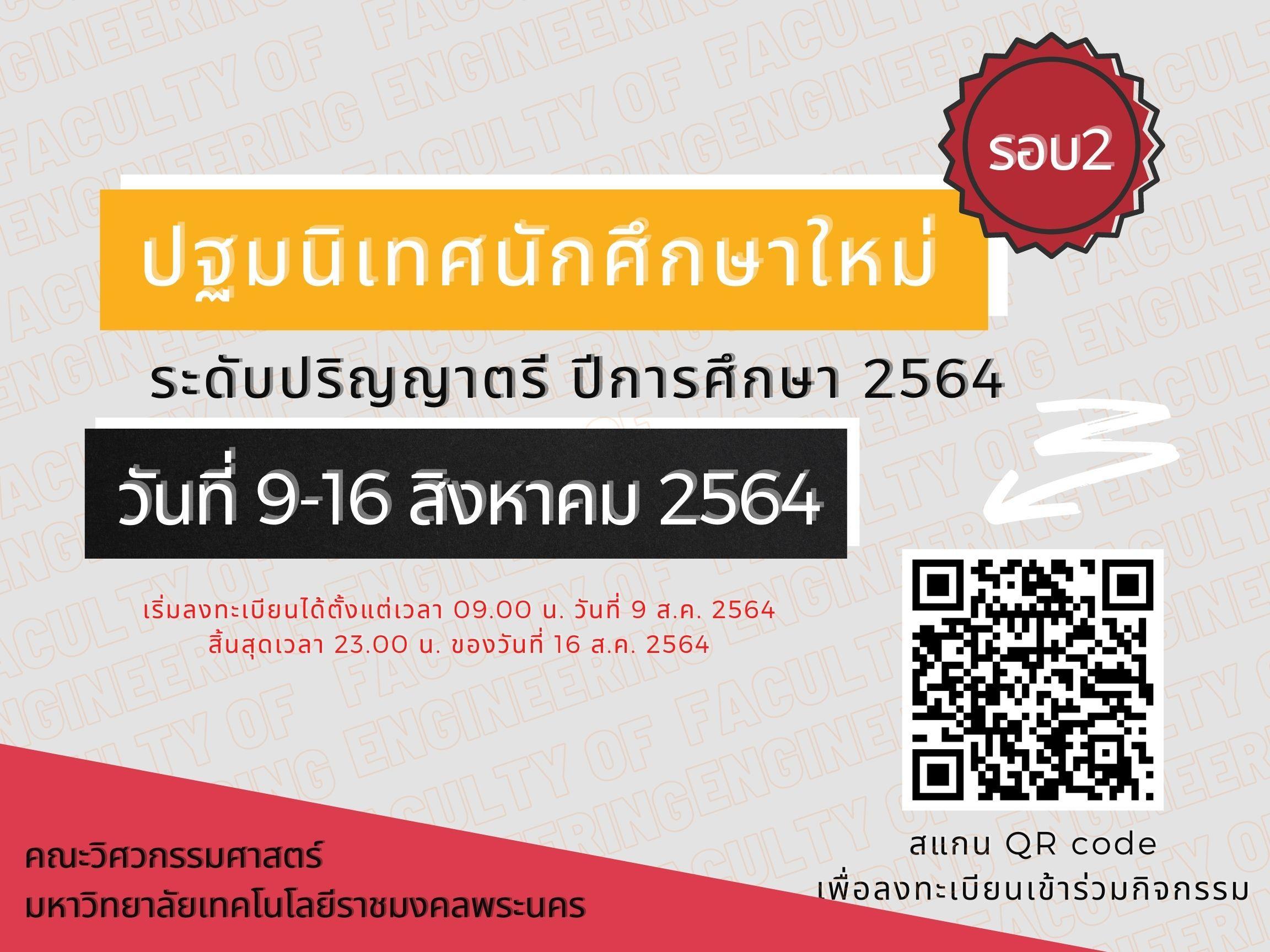 ขอเชิญนักศึกษาใหม่ #ระดับปริญญาตรี ปีการศึกษา 2564 เข้าร่วมโครงการปฐมนิเทศนักศึกษาใหม่ (รอบ2) ระดับปริญญาตรี ประจำปีการศึกษา 2564 (รูปแบบออนไลน์) ระหว่างวันที่ 9-16 สิงหาคม 2564