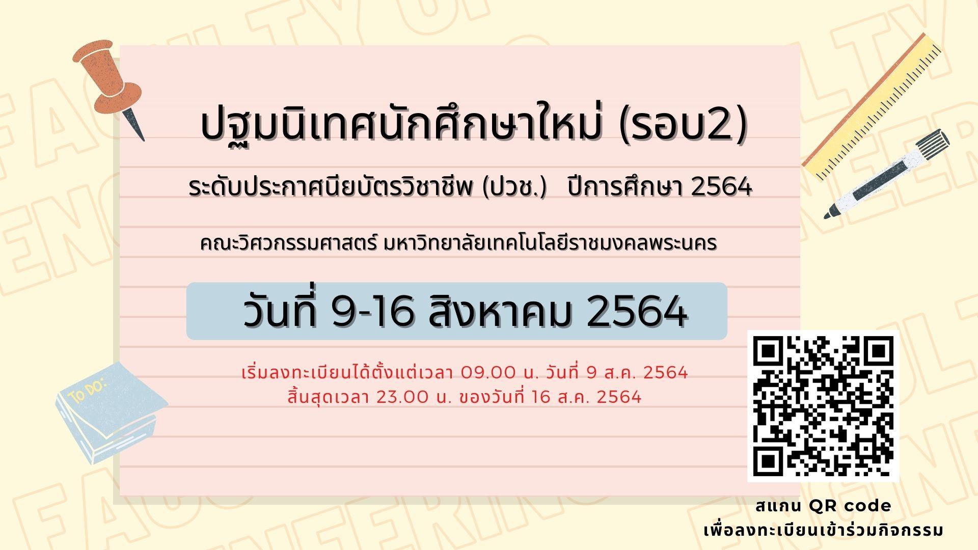 ขอเชิญนักเรียนใหม่ #ระดับประกาศนียบัตรวิชาชีพ (ปวช.) ปีการศึกษา 2564 เข้าร่วมโครงการปฐมนิเทศนักศึกษาใหม่ (รอบ2) ระดับประกาศนียบัตรวิชาชีพ (ปวช.) ประจำปีการศึกษา 2564 (รูปแบบออนไลน์) ระหว่างวันที่ 9-16 สิงหาคม 2564