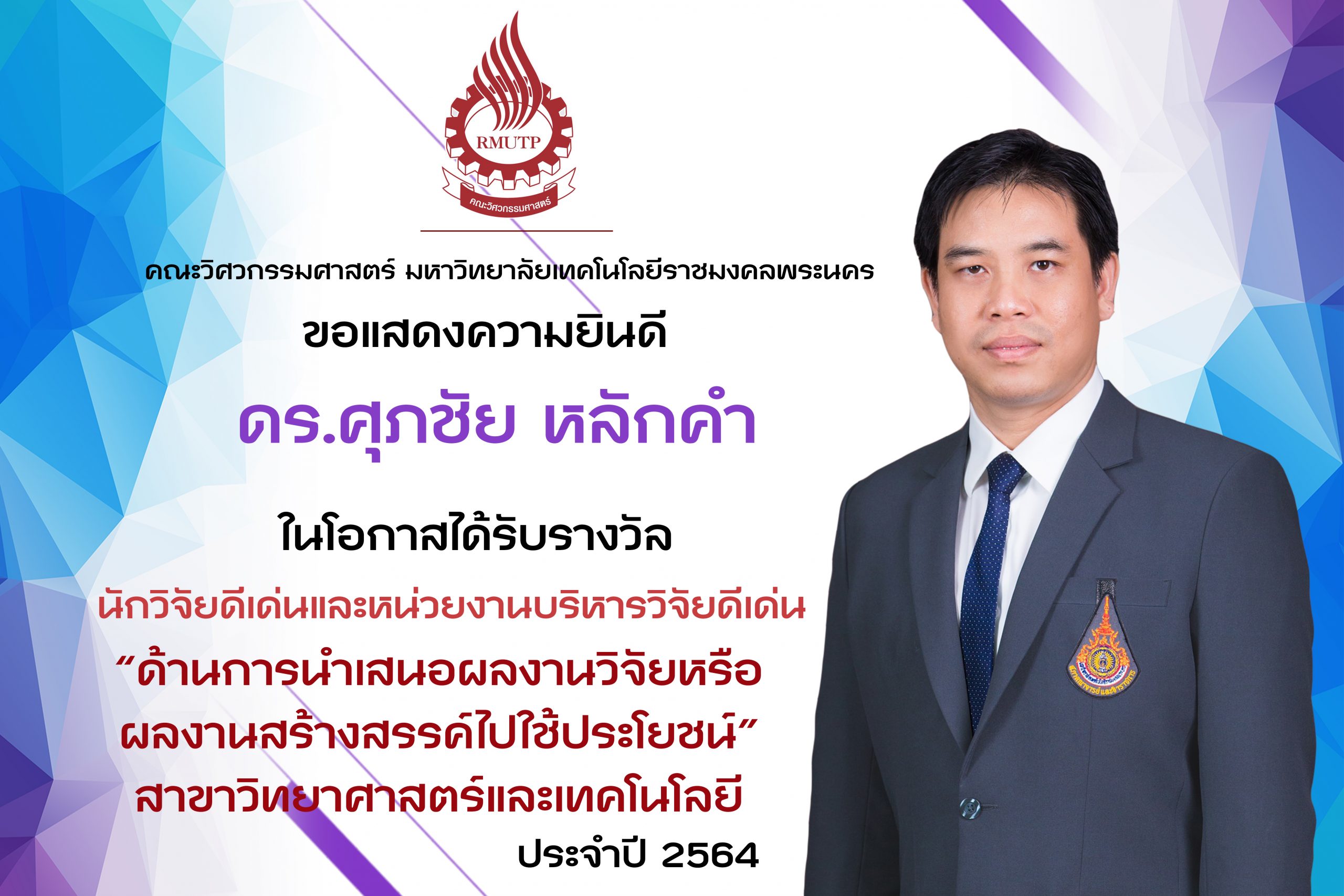 ดร.เทอดพงษ์ แดงสี ในโอกาสได้รับรางวัล นักวิจัยดีเด่นและหน่วยงานบริหารวิจัยดีเด่น “ด้านการขอรับทุนวิจัยจากภายนอก” สาขาวิทยาศาสตร์และเทคโนโลยี