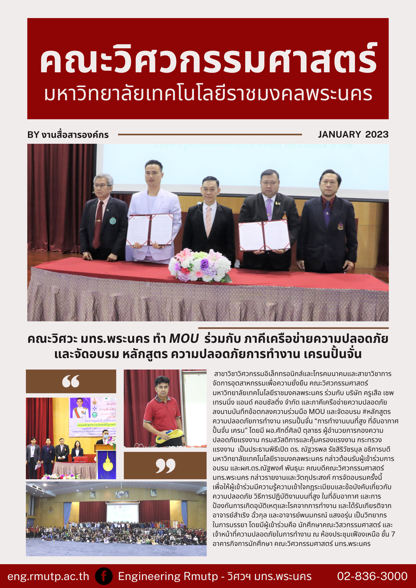 กิจกรรมคณะวิศวกรรมศาสตร์ คณะวิศวะ มทร.พระนคร ทำ MOU ร่วมกับ ภาคีเครือข่ายความปลอดภัย และจัดอบรม หลักสูตร ความปลอดภัยการทำงาน เครนปั้นจั่น Posted January 30, 2023 admin ภาพกิจกรรมเพิ่มเติม