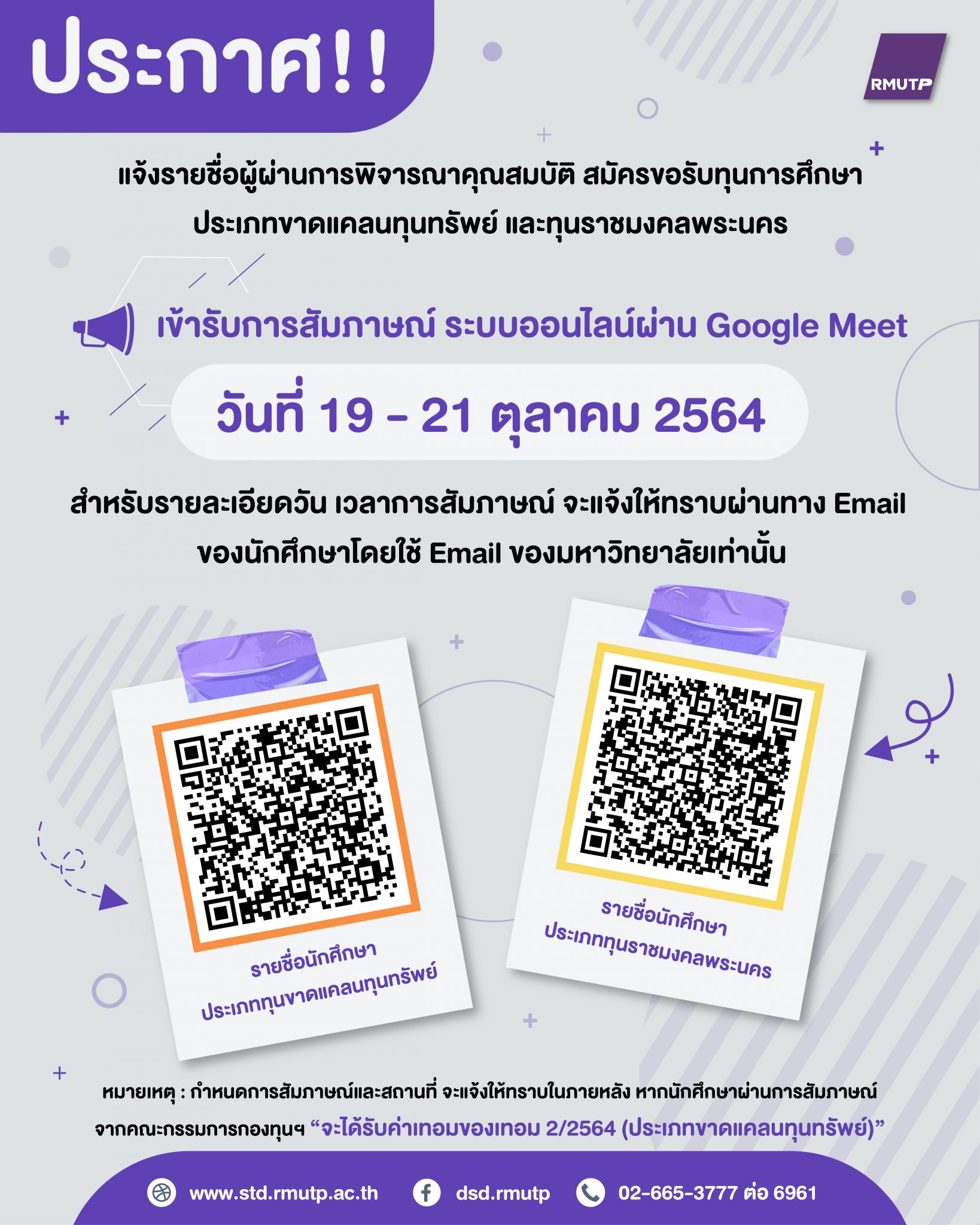 - การเข้ารับการสัมภาษณ์แบบออนไลน์จะใช้โปรแกรม Google Meet ผ่านคอมพิวเตอร์ หรือ โทรศัพท์มือถือ โดยต้องเป็นอุปกรณ์ที่มีกล้อง และไมโครโฟนที่สามารถสื่อสารได้ทั้งภาพและเสียง