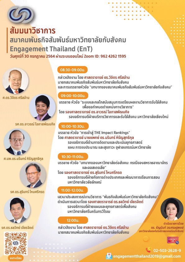 ขอเชิญร่วมสัมมนาวิชาการสมาคมพันธกิจสัมพันธ์มหาวิทยาลัยกับสังคม Engagement Thailand (EnT) วันศุกร์ที่ 30 กรกฎาคม 2564 ผ่านระบบออนไลน์ Zoom ID: 962 4262 1595