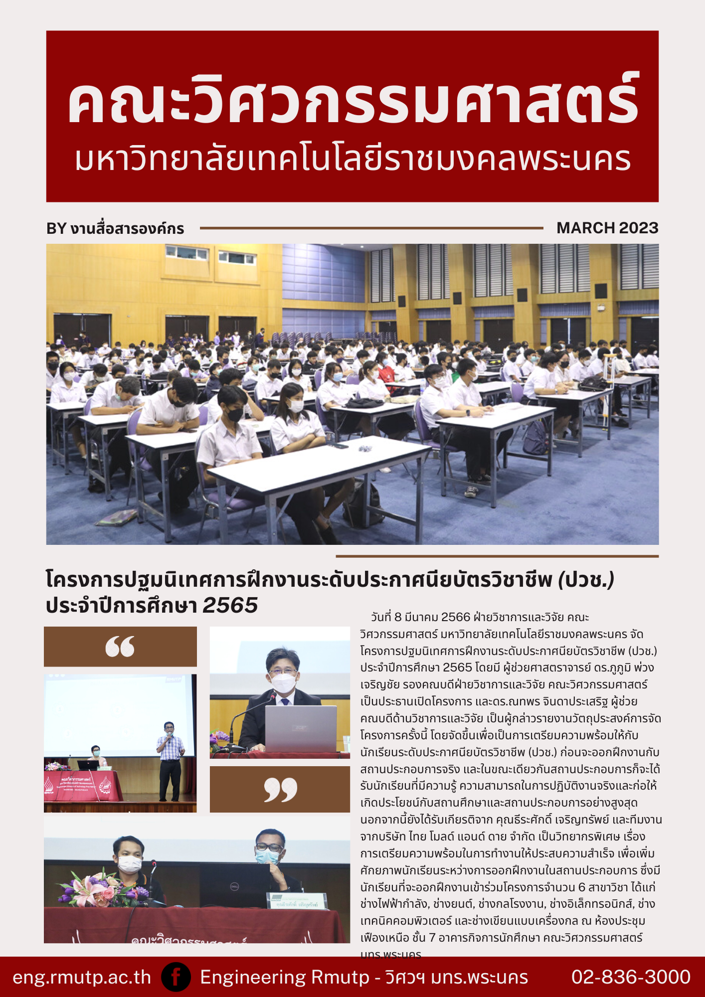 กิจกรรมคณะวิศวกรรมศาสตร์ โครงการปฐมนิเทศการฝึกงานระดับประกาศนียบัตรวิชาชีพ (ปวช.) ประจำปีการศึกษา 2565 Posted March 8, 2023 admin ภาพกิจกรรมเพิ่มเติม