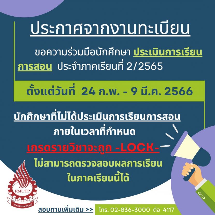 ขอความร่วมมือนักศึกษา ประเมินการเรียนการสอนที่ระบบบริการการศึกษา ประจำภาคเรียนที่ 2/2565 ตั้งแต่บัดนี้ […]
